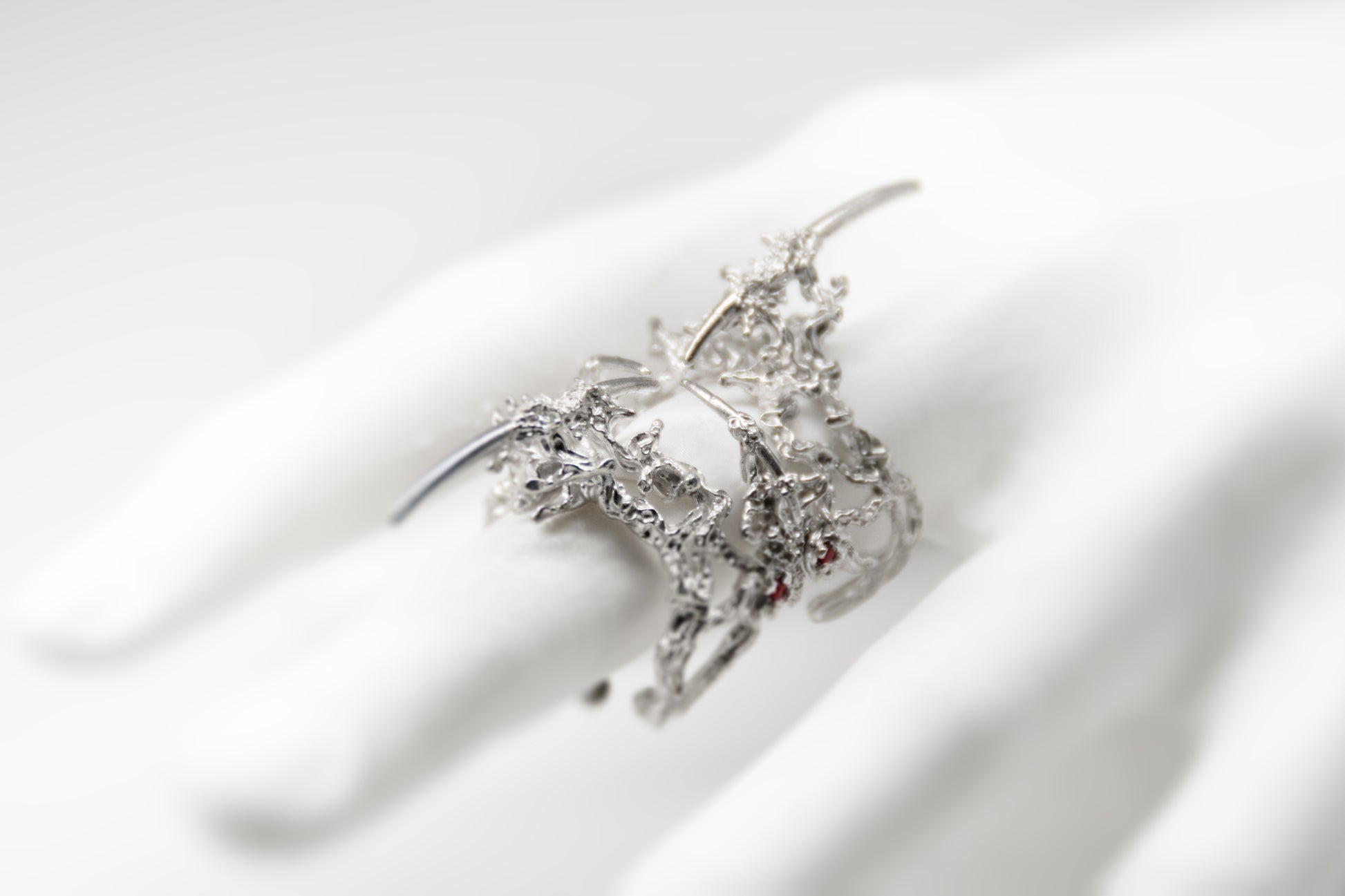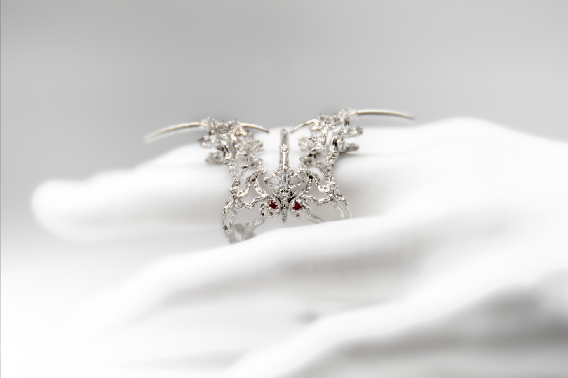 Spine, simbolo arcaico di sofferenza e protezione, radicato nell’immaginario pagano, medievale e cristiano. Le linee intrecciate e affilate richiamano le corone sacre, fondendo eleganza a forme che evocano fossili ossei.