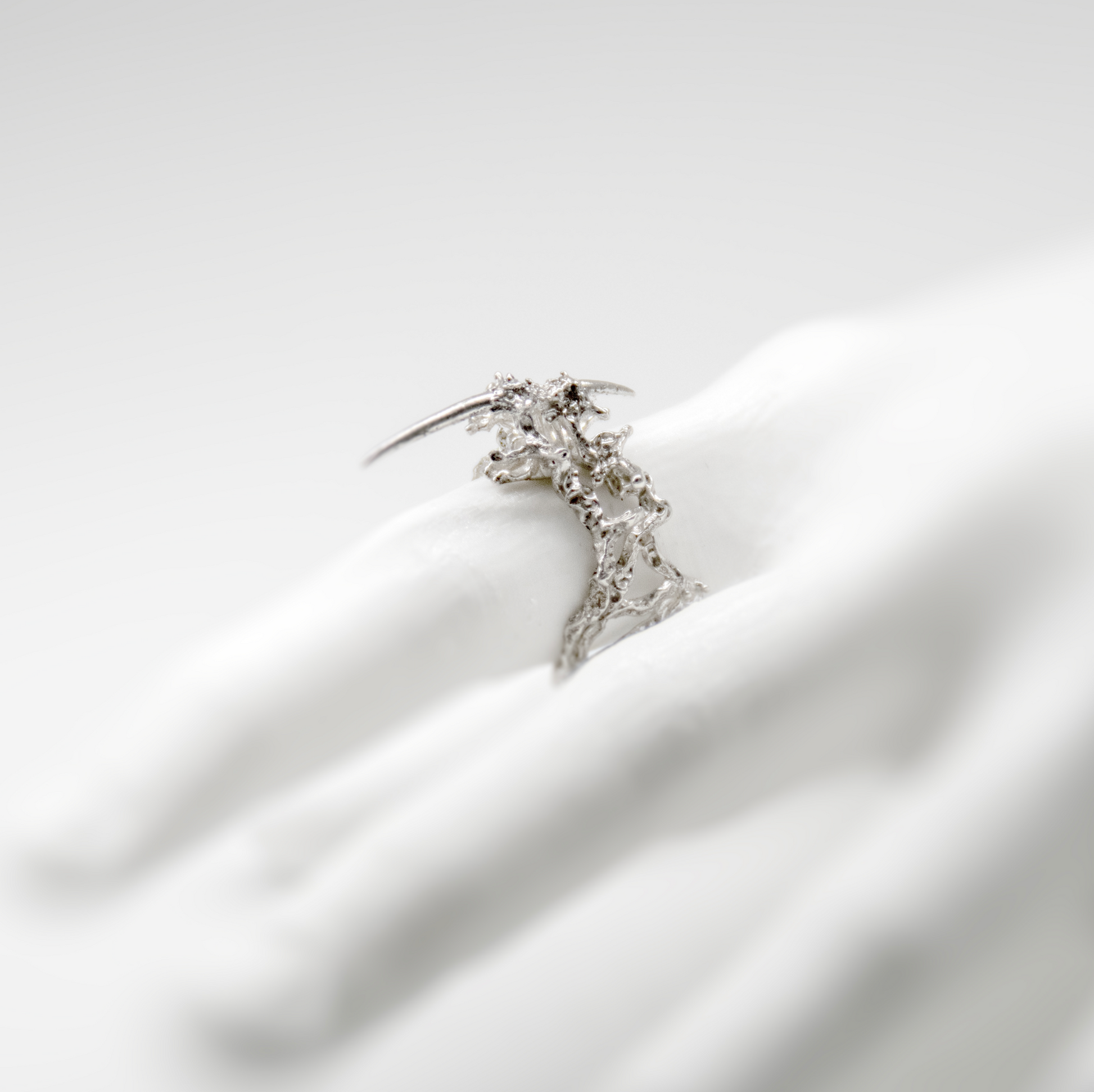 Spine, simbolo arcaico di sofferenza e protezione, radicato nell’immaginario pagano, medievale e cristiano. Le linee intrecciate e affilate richiamano le corone sacre, fondendo eleganza a forme che evocano fossili ossei.