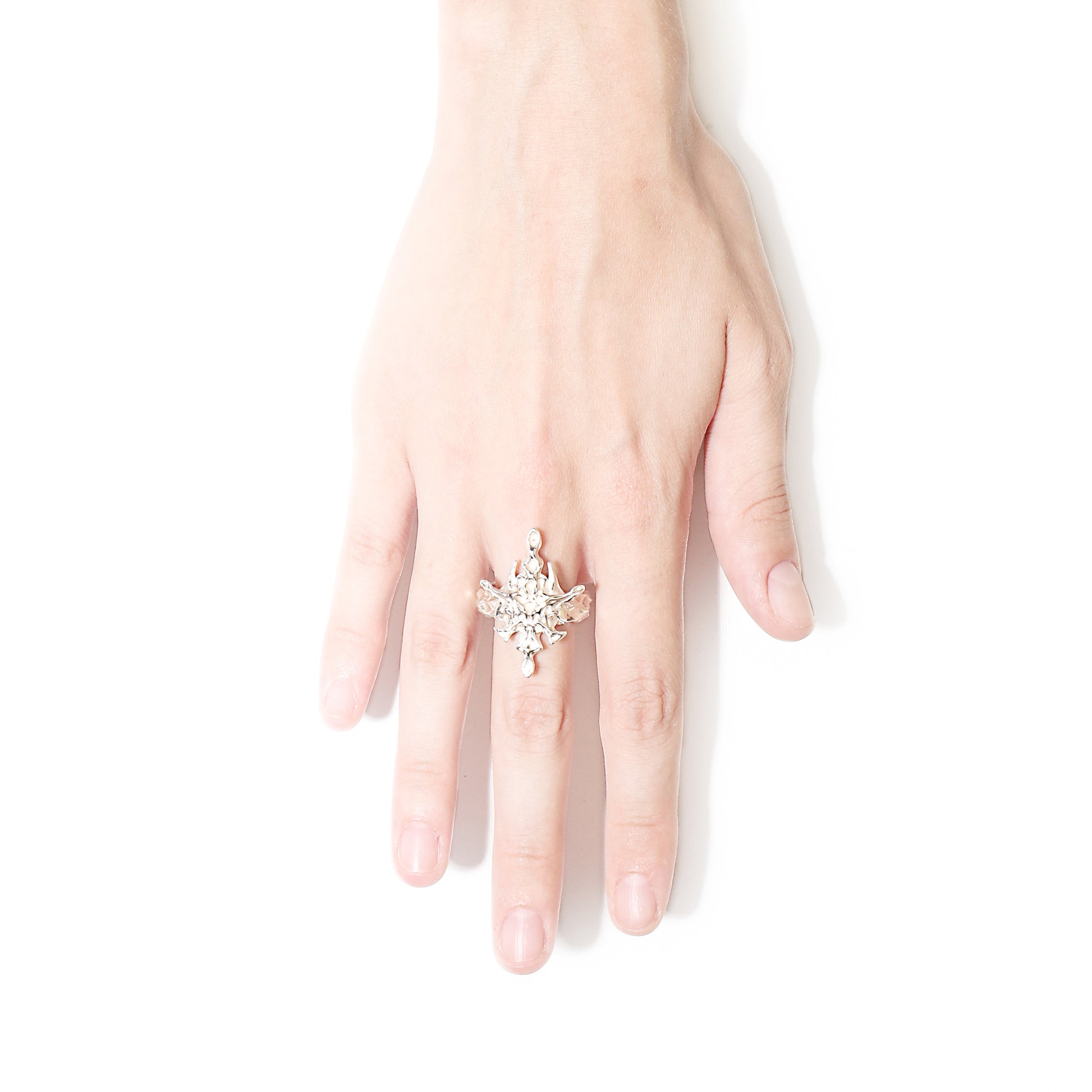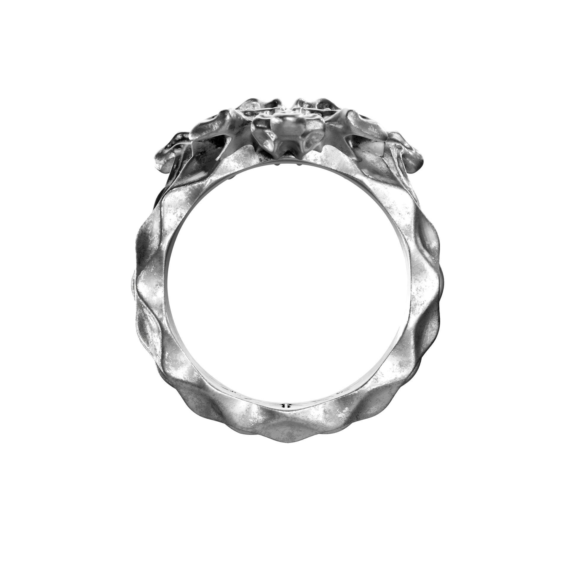 Ogni anello è realizzato a mano in Argento 925, con dettagli che ne rendono unica ogni variante. La custodia in ferro battuto ospita l’anello immerso in un blocco di sabbia nera di origine vulcanica.